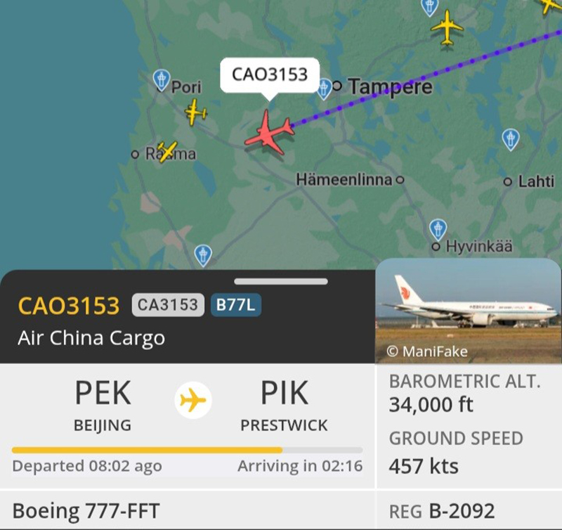 Retkillä näkee lintujen lisäksi muutakin kiinnostavaa. Ratikkaa odottaessani huomasin, että lentokone veti kymmenen kilometrin korkeudessa siniselle taivaalle valkoista vanaa. Arvelin koneen olevan matkalla Kaukoidästä Tukholmaan, ja tarkistin asian FlightRadarista. Kiinalaisyhtiön rahtikoneen lähtöpaikka oli Peking, mutta määränpää Prestwick, Glasgown kakkoskenttä. Tänään näkemäni koneen suuntana oli Rovaniemi ja lähtöpaikka Istanbul.
