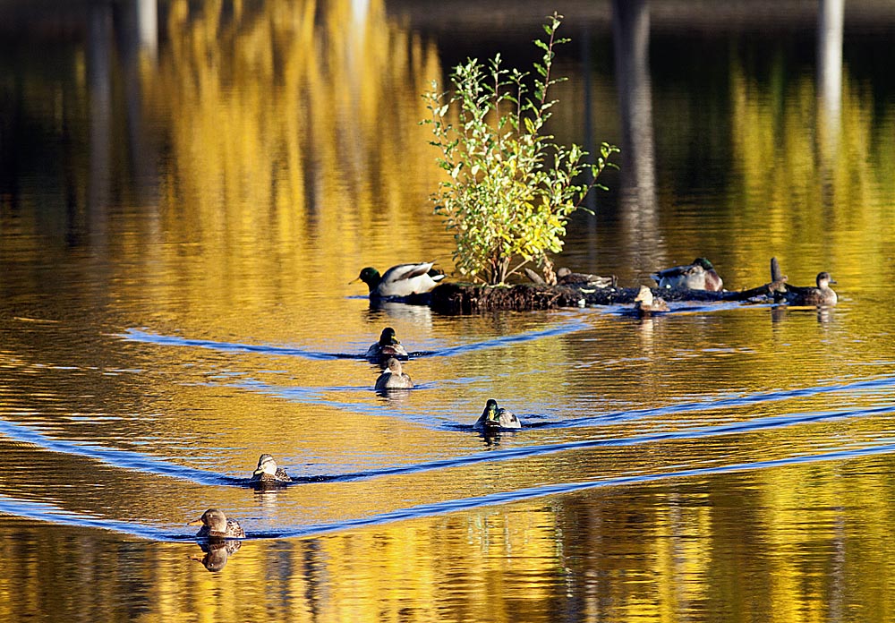 Pian piti pysähtyä uudelleen: kymmenkunta sorsaa nautti syysauringosta pikkuruisella saarella keskellä lampea. Saarella kasvava paju oli vielä vihreä, mutta vesi ympärillä hehkui ruskan väreissä.