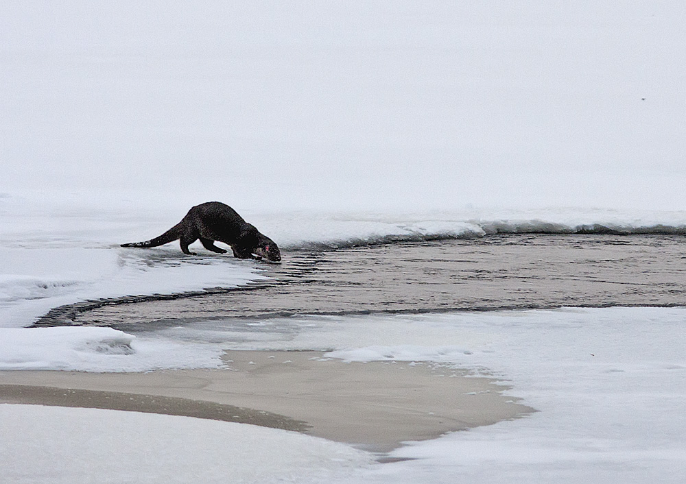 Näin saukon Ounaskoskella ensimmäisen kerran 16.1.2010. Nykyinen tilanne muistuttaa aikaa ennen sitä: vain jälkiä näkyy ja niitäkin harvakseen.