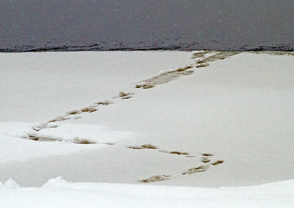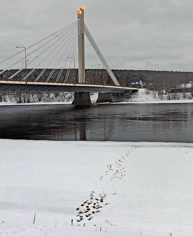 Etelästä palattuani kiiruhdin jokirantaan katsomaan Ounaskosken sulaan ilmestynyttä pilkkasiipeä. En nähnyt lintua, mutta panin merkille jäälle ilmestyneet jäljet. Joku – arvelen että jokijään petollisuudesta tietämätön turisti – oli käynyt ihmettelemässä virtaavaa vettä. Olisikohan aika tehostaa varotoimia?