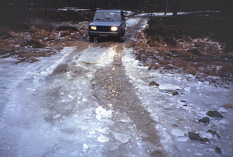 Sateinen syksy oli paisuttanut tieuran poikki virtaavat purot lähelle keväisiä mittoja. Viikolla oli ollut pakkasta, mutta ei tarpeeksi: edelläni oli mennyt nelipyöräinen jäänmurtaja. Kysymys oli nyt maavarasta, ulottuivatko Ladan renkaat pohjaan, vai jäisikö ajokki keskelle puroa nolosti mahansa varaan. Mittailin syvyyksiä ja päätin yrittää vauhdilla. Pääsin yli.