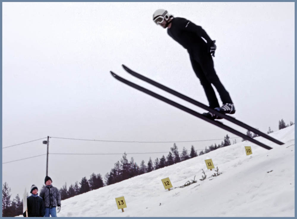 Oheinen poiminta on esitykseni urheiluosuudesta: Jorma Luhta tyylittelee Ounasvaaran pikkumäessä. Kuvausvuodesta en ole varma, mutta veikkaan vuotta 2002. Tässä tapauksessa ajoitus ei onnistu tyylin tai varusteiden perusteella.
